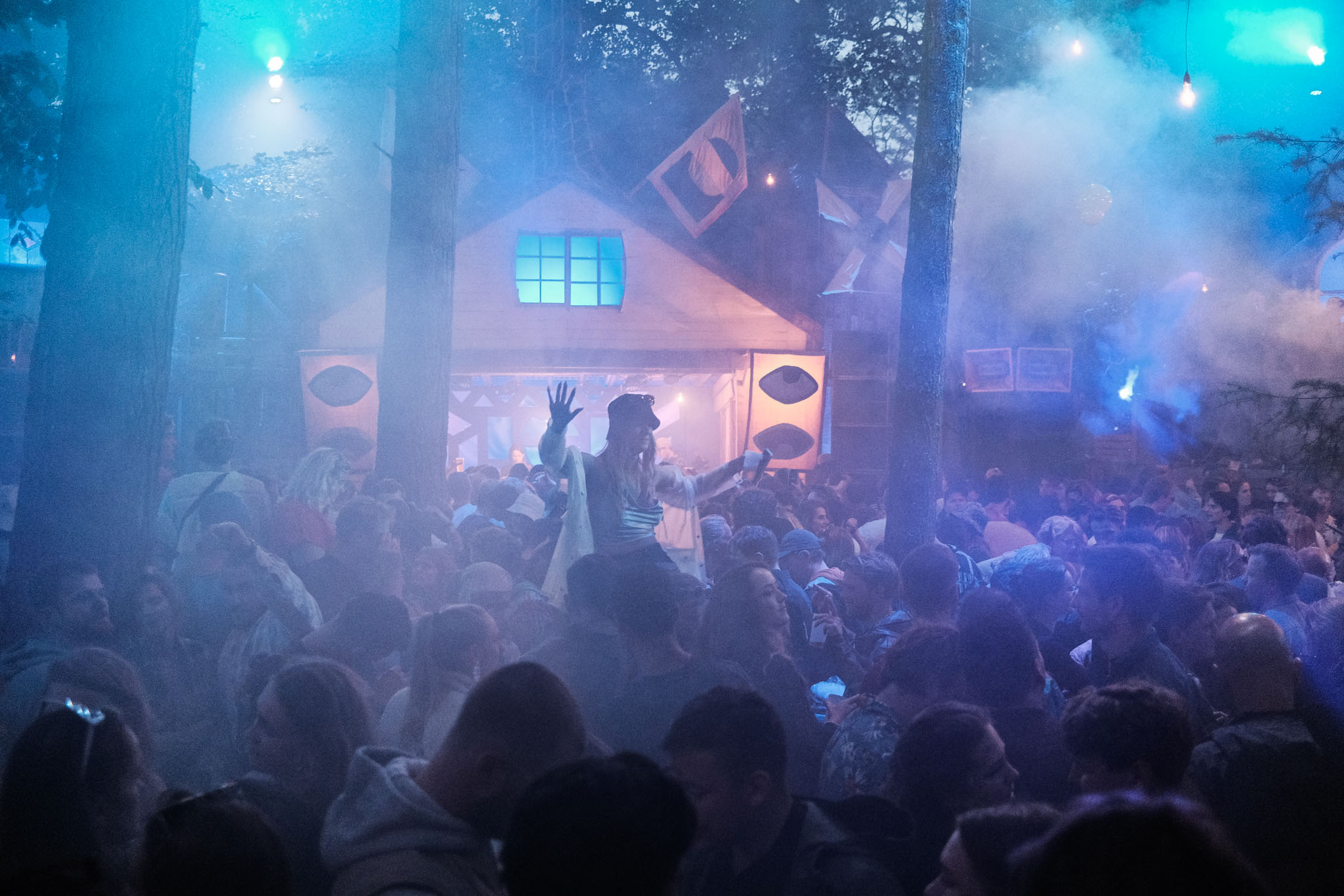 Timo: ‘Wat ik zelf heel vet vind, is dat het openluchttheater (Bosspot, red.) van links tot rechts en van voor tot achter rammetjevol staat. Dat is in de geschiedenis van Into the Woods nog nooit gebeurd. In de eerste jaren hadden we een steiger-stellage over de tribune gebouwd. Dat was vet, het stond vol, maar niet zó vol. We hebben nog een record aangetikt volgens mij en dat is dat nog nooit zoveel mensen tegelijk in het openluchttheater hebben gestaan. Komt ook door de vlakke vloer die we onderaan hebben gecreëerd, met de dj-booth in een Boiler Room-achtige setting zodat het publiek eromheen kan staan. Voor mij is dat dé verrassing van deze editie, dat het zo goed werkt. In 2019 hadden we daar livemuziek geprogrammeerd. Dan stroomde het tijdens de change-overs leeg. De tribunes zijn te groot om het binnen een uur weer vol te laten stromen. Nu blijven mensen hangen, want de dj’s draaien in elkaar door.’
