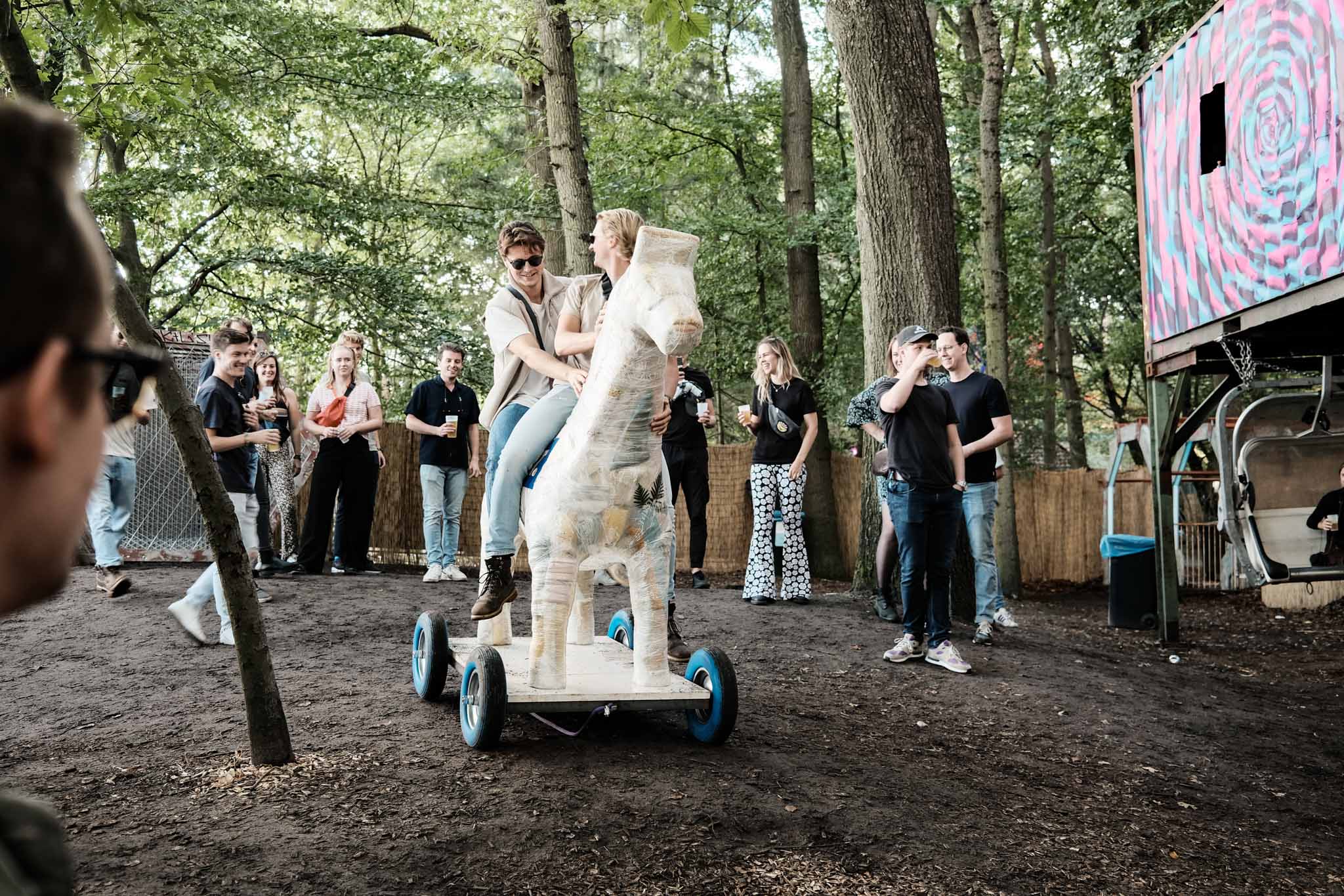 Maurice: ‘En de BoomBoom van de kunstenaars van ATMosphere. Die staat op Wildeburg, op ADE, maar ik vind hem hier echt bizar goed geplaatst. We bouwden hier altijd al een toren als decor, maar hij is nog nooit zo hoog geweest als nu. En functioneel, want er is continu feest bovenin en bizarre theatrale performances. Ik maak zelf altijd een grap tegen vrienden: ‘Heb je ’s nachts die lichten erop gezien? Teringwerk man, al die led-stripjes.’ Maar dat is gewoon gevideomapped, haha.’ Timo: ‘Ik probeerde het aan mijn ouders uit te leggen, maar die snapten er ook niks van.’