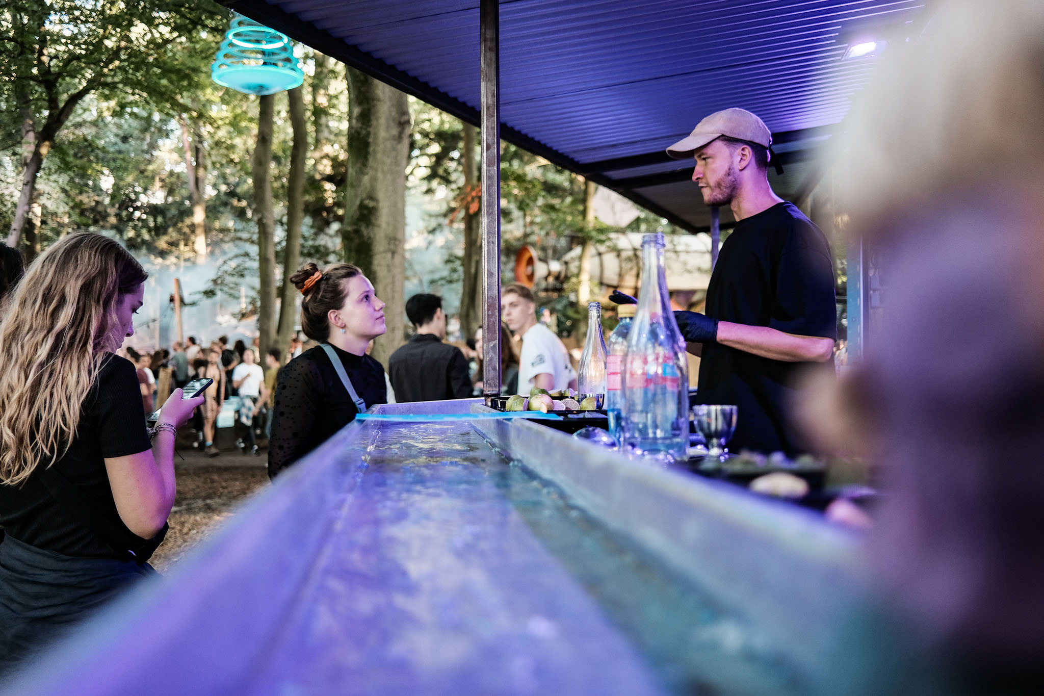 We vervolgen onze bosronde en mijn mond valt open bij het nieuwe werk van ATMosphere, verantwoordelijk voor de creatie Boomboom en nu ook voor die van de Watermaker, een bar die gehost wordt door Barleduc. Met de verwondering van een kind staar ik naar het spel met water dat zich voor mij ontvouwt. Het zilveren vocht stort prachtig uitgelicht uit een grote silo omlaag en glijdt vervolgens langs draaiende delen (een reuzenrad!), door sluisjes en kuipjes. Als je hier een waterfrisse cocktail bestelt, stroomt het als een kleine rivier voor je langs. VET!